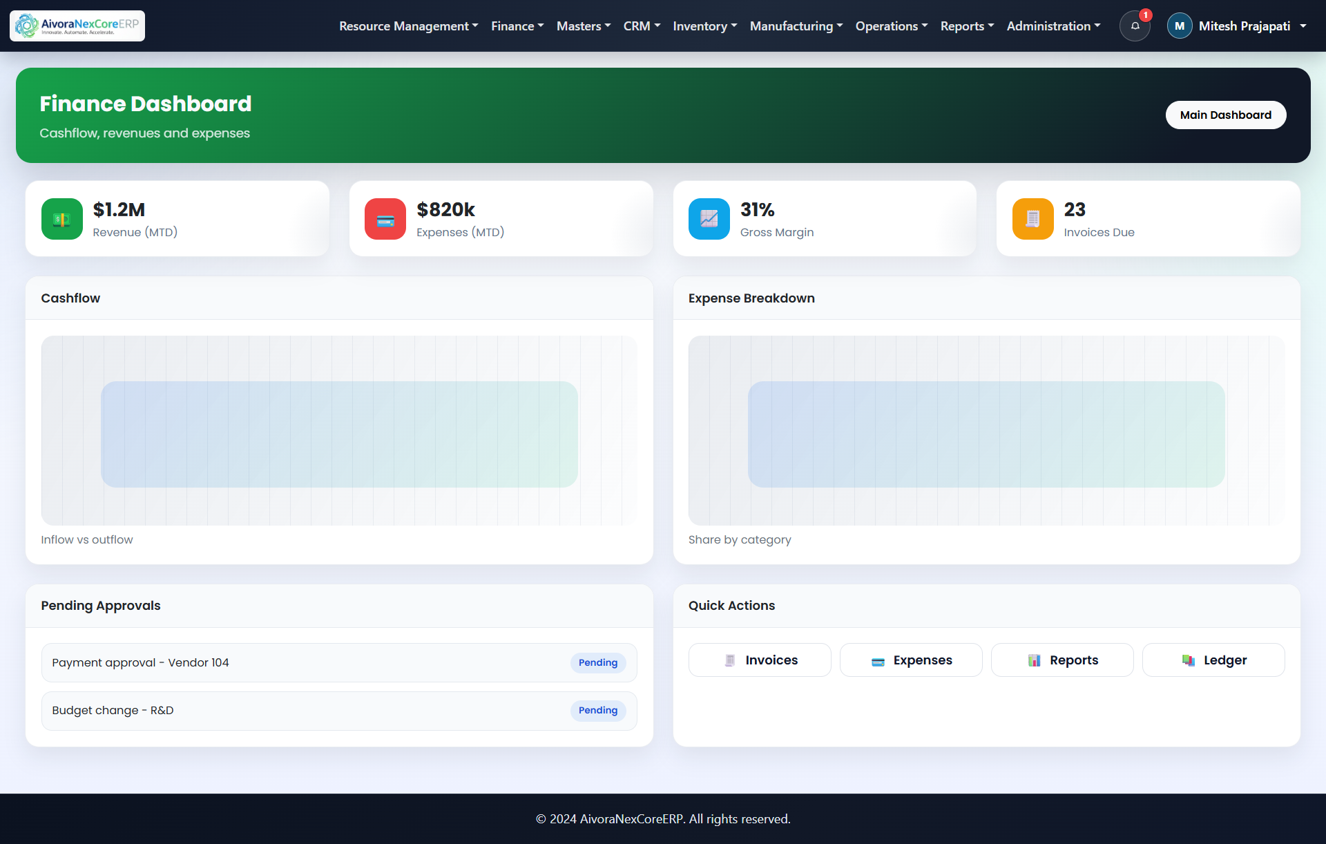 AivoraNexCoreERP connects every core function through one data model, one workflow engine, and one decision dashboard.